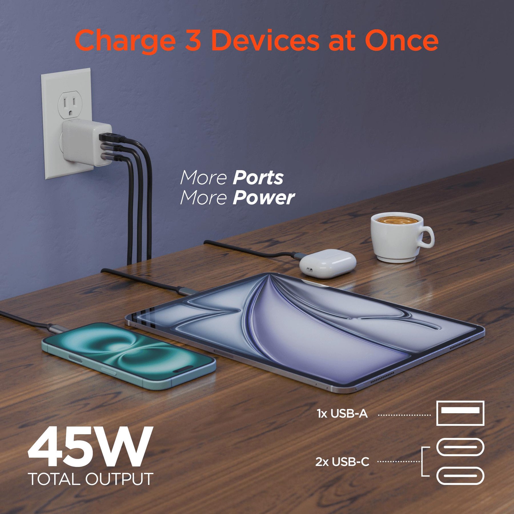 More ports. More power. This charger slides into your day with two USB-C ports and one USB-A port, delivering up to 45W maximum output. Thanks to PPS-enhanced Power Delivery, it can juice up iPhone 16 or Galaxy S25 from 0 to 50% in about 25 minutes, while still being powerful enough to run notebook laptops like MacBook Air or Surface Pro. All in a next-gen GaN chassis that stays cooler and fits almost anywhere—because you don’t need a space heater to power your devices.
