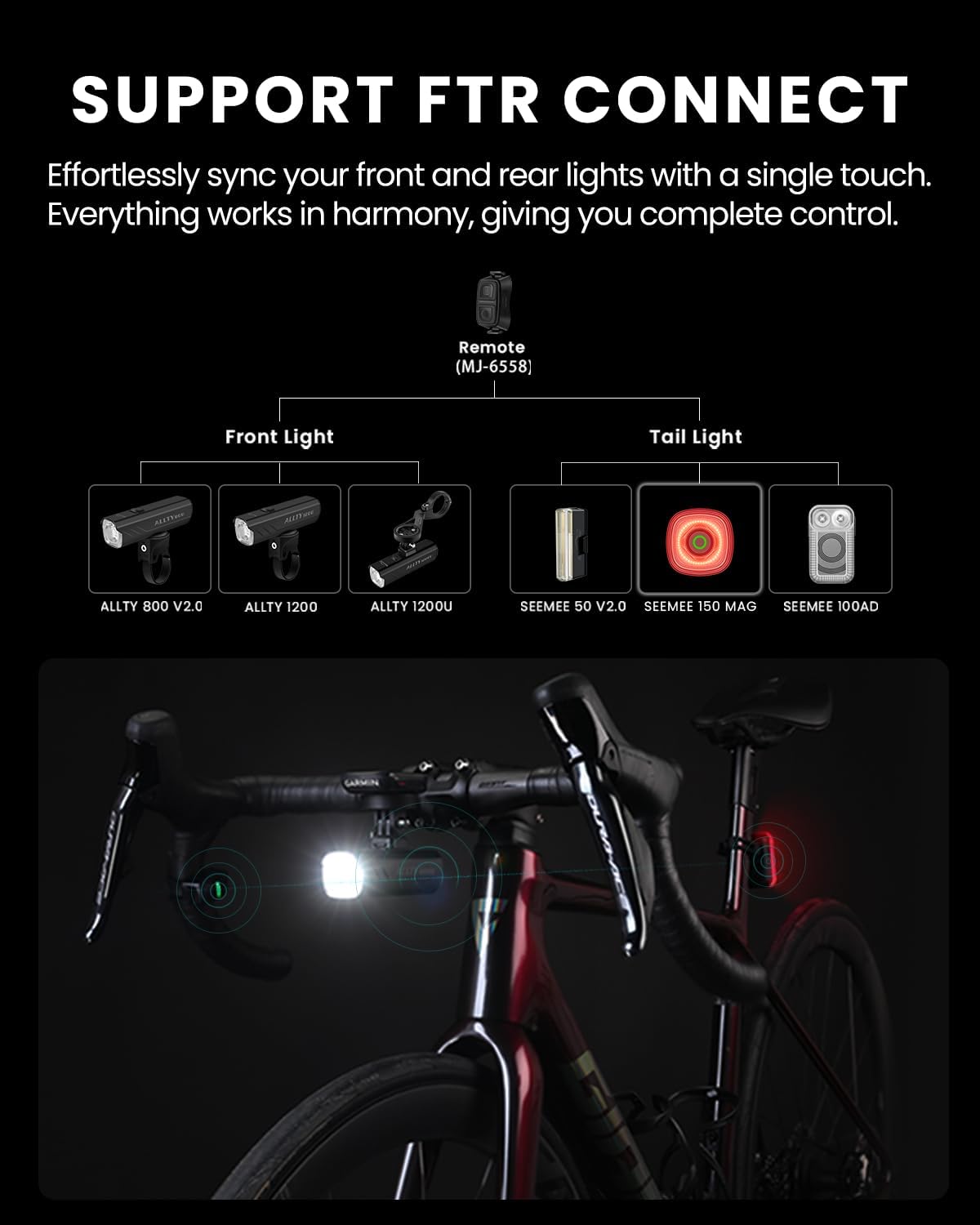 • Supports FTR LightSync: FTR LightSync delivers one-touch control via MJ-6558 remote to control ALLTY 800 V2.0/1200/1200U front lights and SSEEMEE 150MAG/50 V2.0 taillights.