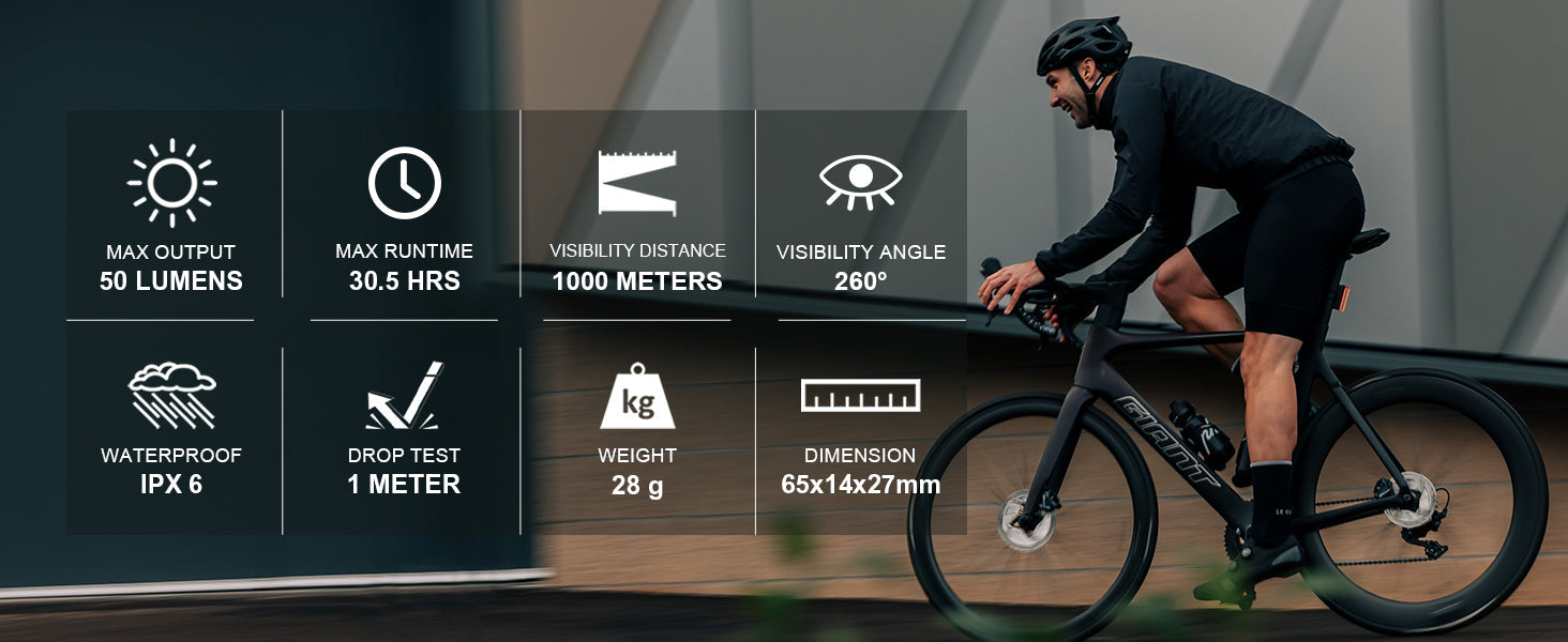 • Ultra-Bright Rear Bike Light 50 Lumens: Optillumin lens helps provide maximum 50 lumens light output, compact design, the bicycle rear light incorporates a high-transparency optical strip capable of emitting a vivid 50 lumens