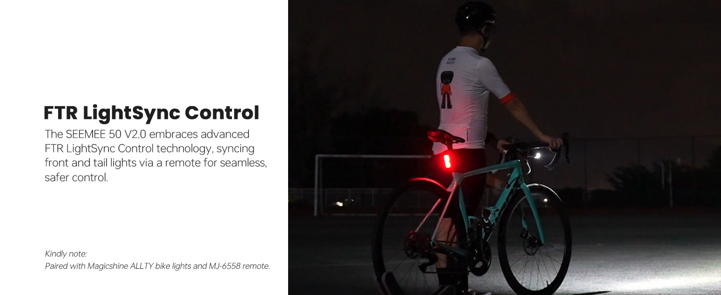• FTR Intelligent One-touch Control: The bicycle tail lights for night riding with FTR LightSync control technology, syncing front and tail lights via a remote for seamless, safer night riding (Kindly note that paired with Magicshine ALLTY bike light and MJ-6558 remote)