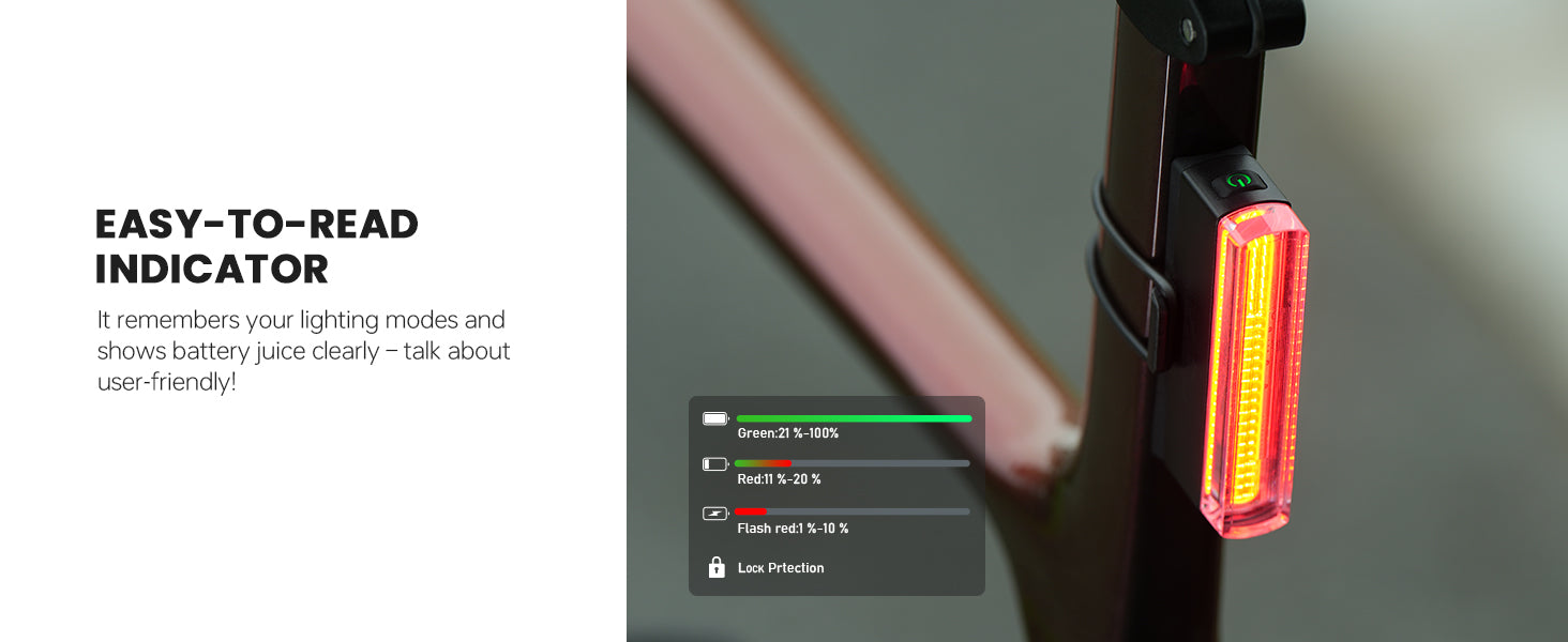 • USB-C Long-Lasting Battery: The smart bike tail light equipped with 430mAh battery, bike tail light rechargeable, keeps going for a solid 30.5 hours. A lock feature to stop accidental turns-on, saving your battery long lasting time. Memory function mode, easy-to-read battery indicator, 5 light modes and USB-C rechargeable to use friendly