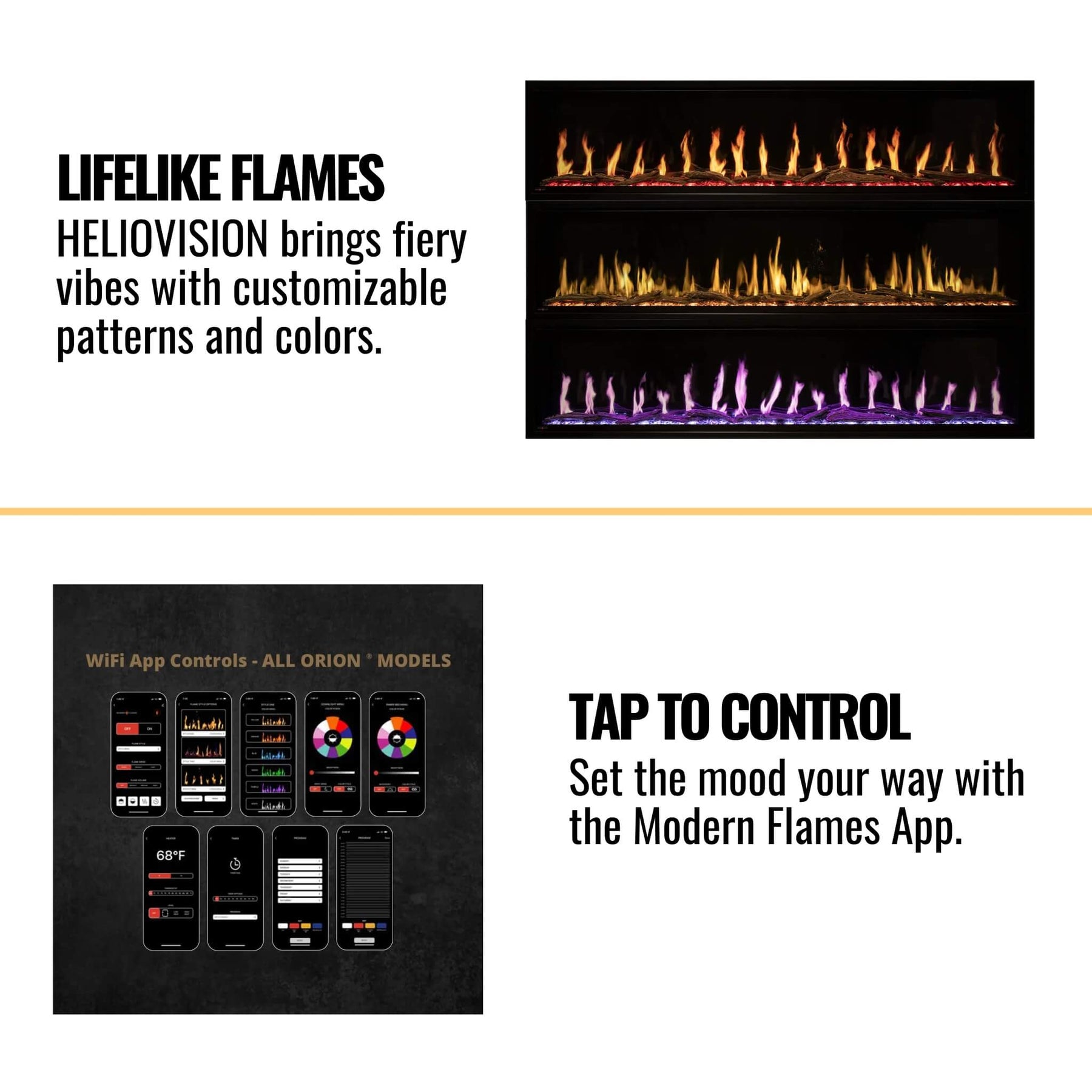 Meet the Modern Flames Orion Slim 100-Inch Heliovision Single-Sided Electric Fireplace (OR100-SLIM): a sleek, built-in centerpiece that brings warmth and wow-factor to modern living spaces. No chimney, no mess—just immersive flame visuals and smart control that makes cozy evenings as easy as tapping your phone.
