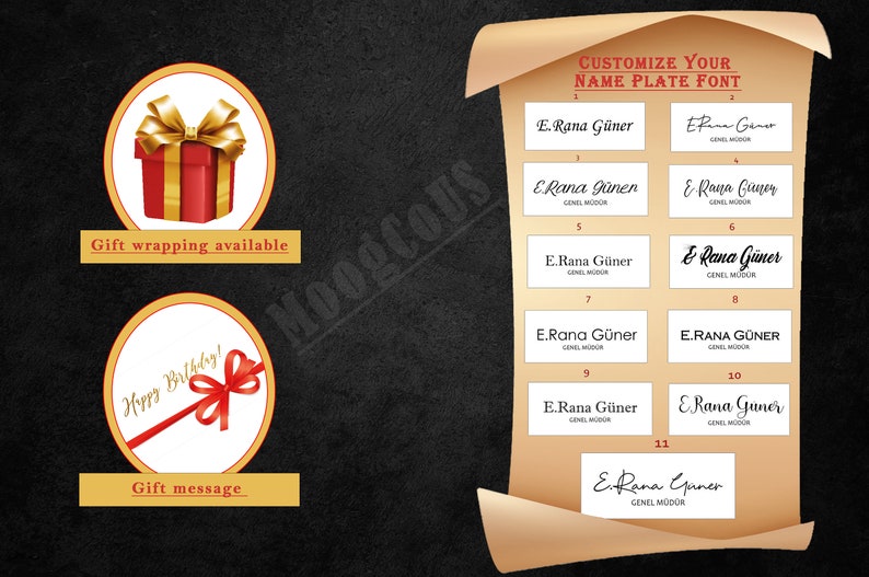 • 12 organizing parts: Desk pad, desk pad with cover, 2 document shelves, note paper holder, 3 leather coasters, pen box, name plate with golden pen set (roller pen and fountain pen), wooden pen set base and name title, business card holder, folding double document tray, desk paper towel holder, desk clock.