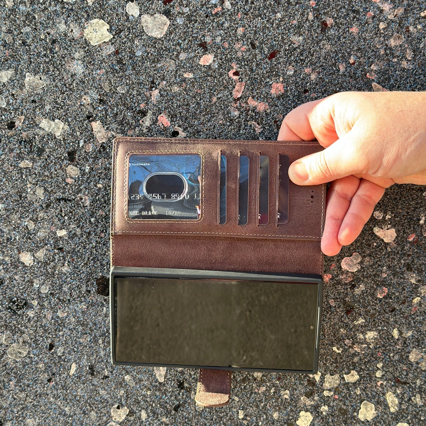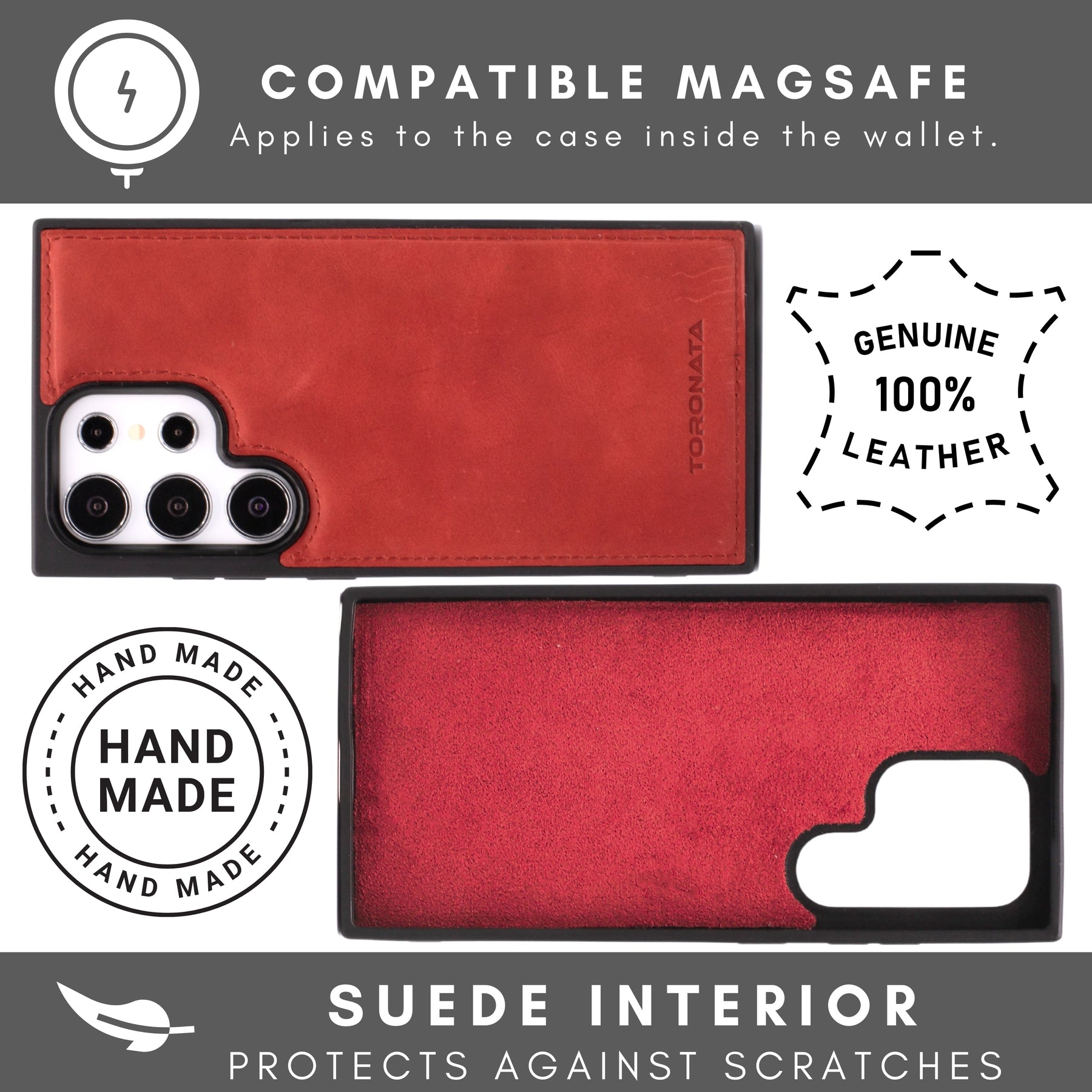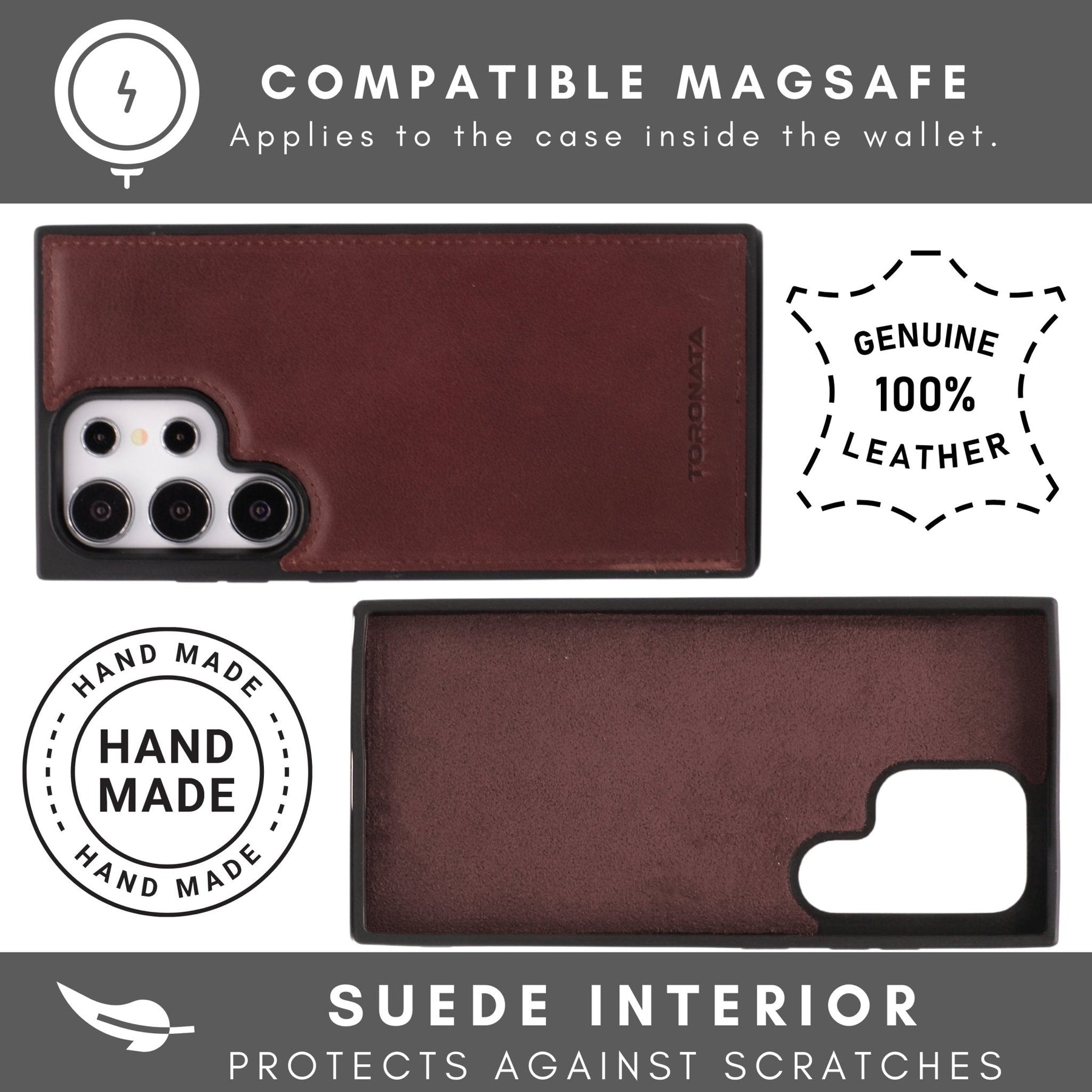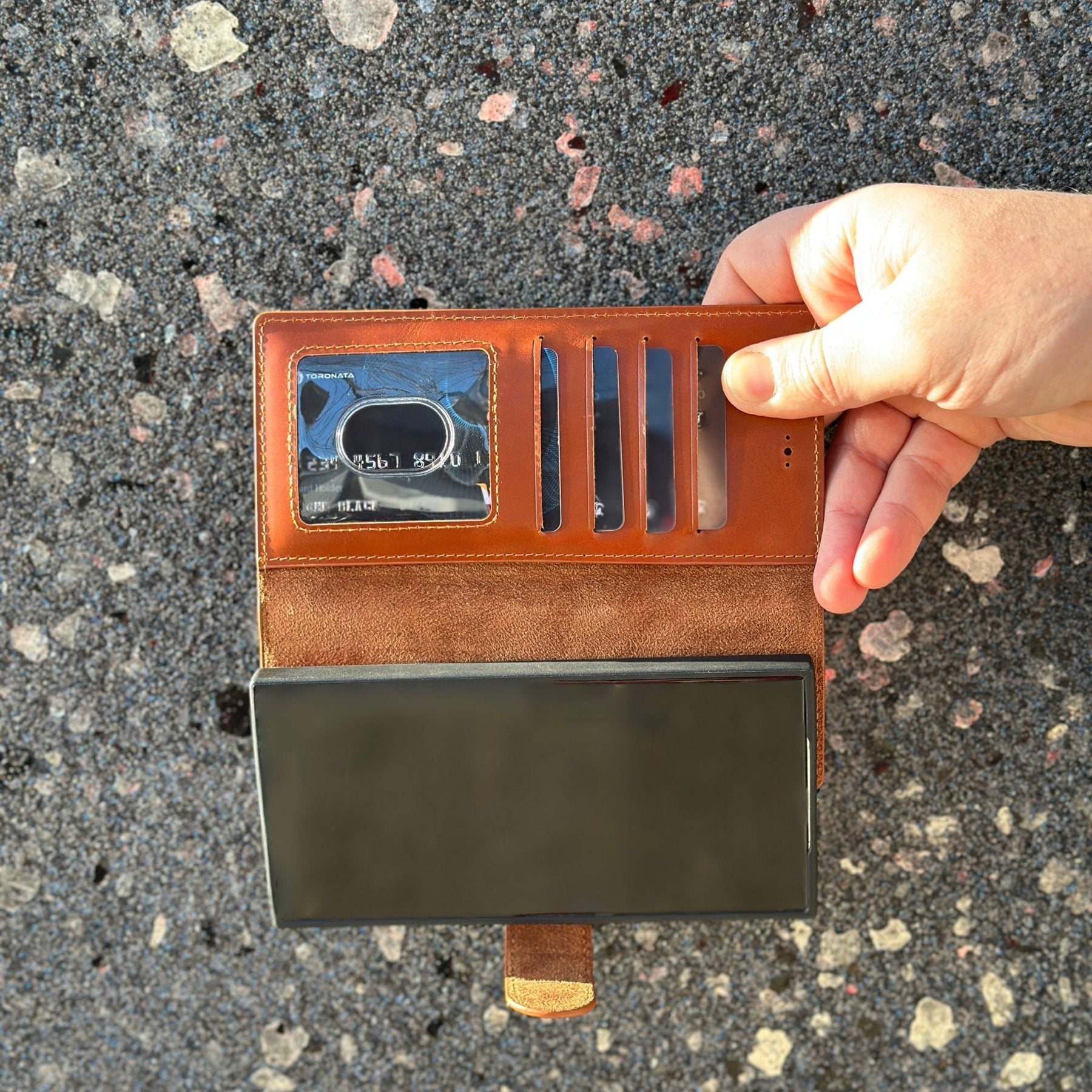 TORONATA Nevada Samsung Galaxy S24 Ultra Wallet Case blends durability with elegance for Samsung Galaxy S24 Ultra users who want built-in card storage, RFID protection, and a hands-free viewing experience. Crafted from genuine cowhide leather, this case protects your device without compromising comfort or style.