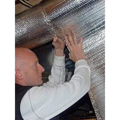 Tempshield® Single Bubble Foil/Foil Reflective Insulation is 1/8" thick and primarily used for duct, pipe, water heater and garage door insulation. It also functions as a vapor barrier. Available in 300, 500, and 750 sq. ft. rolls, with standard widths of 4 and 6 feet.