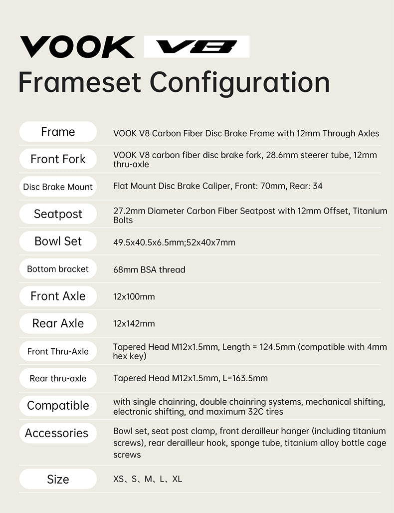 • Lightweight Engineering: The VOOK V8 frame weighs just 690g (unpainted), achieved through intelligent round-tube structural mechanics, strategic use of high-modulus carbon fiber, and EPS internal molding technology. This ensures reduced weight without compromising strength or rigidity.