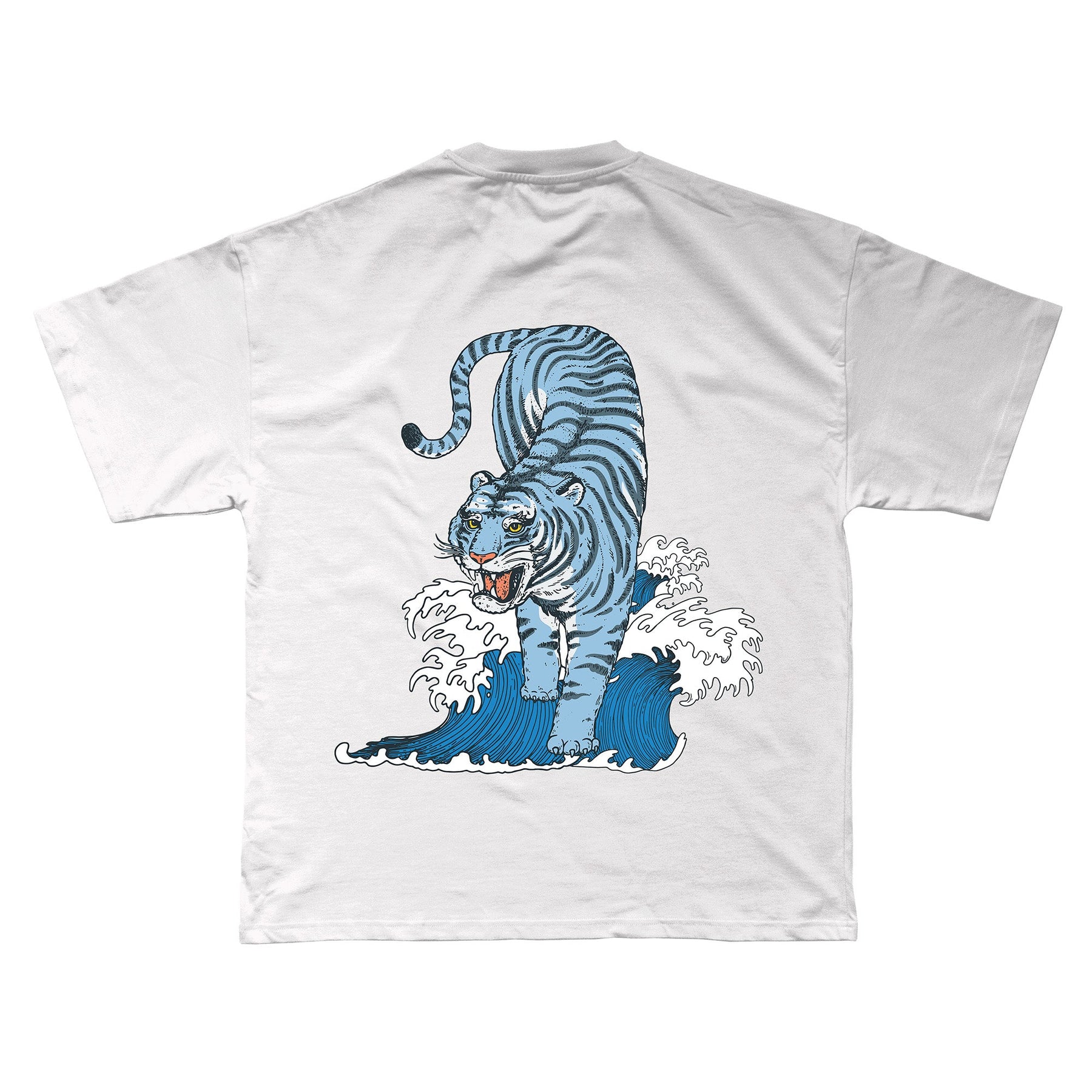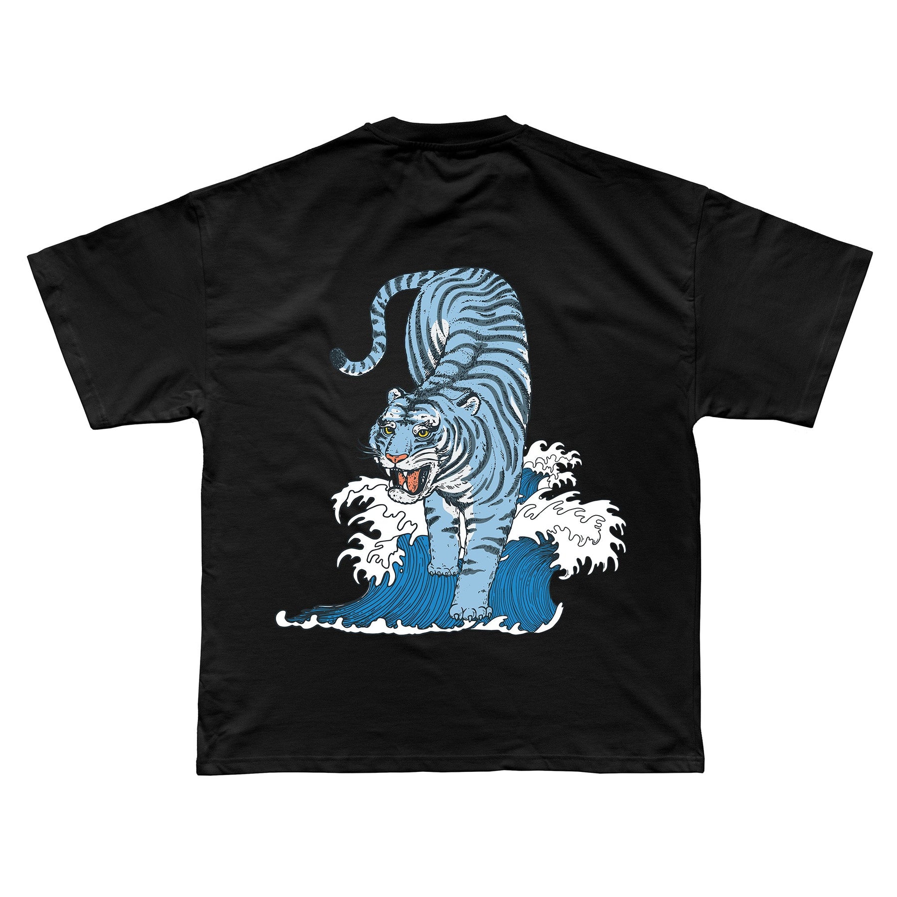 - The short sleeve t-shirt features a blue tiger in great waves design with a box logo Niepce graphic on the bottom
