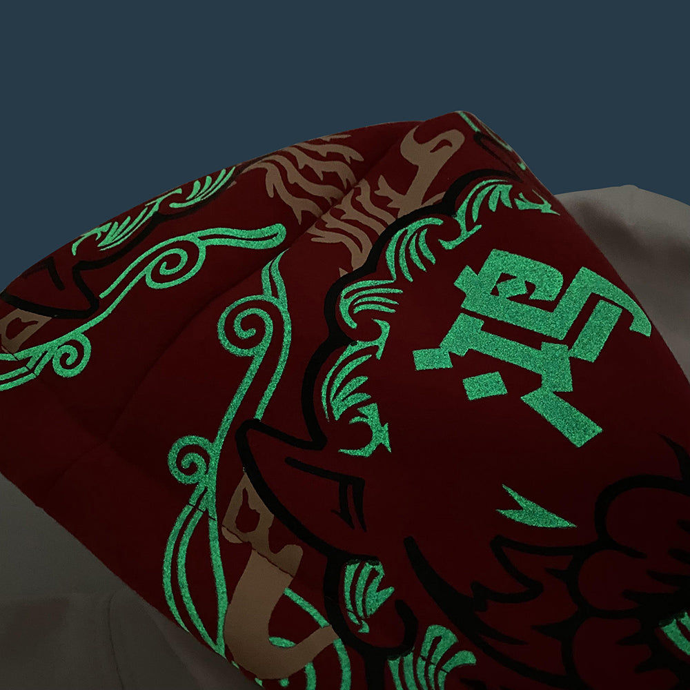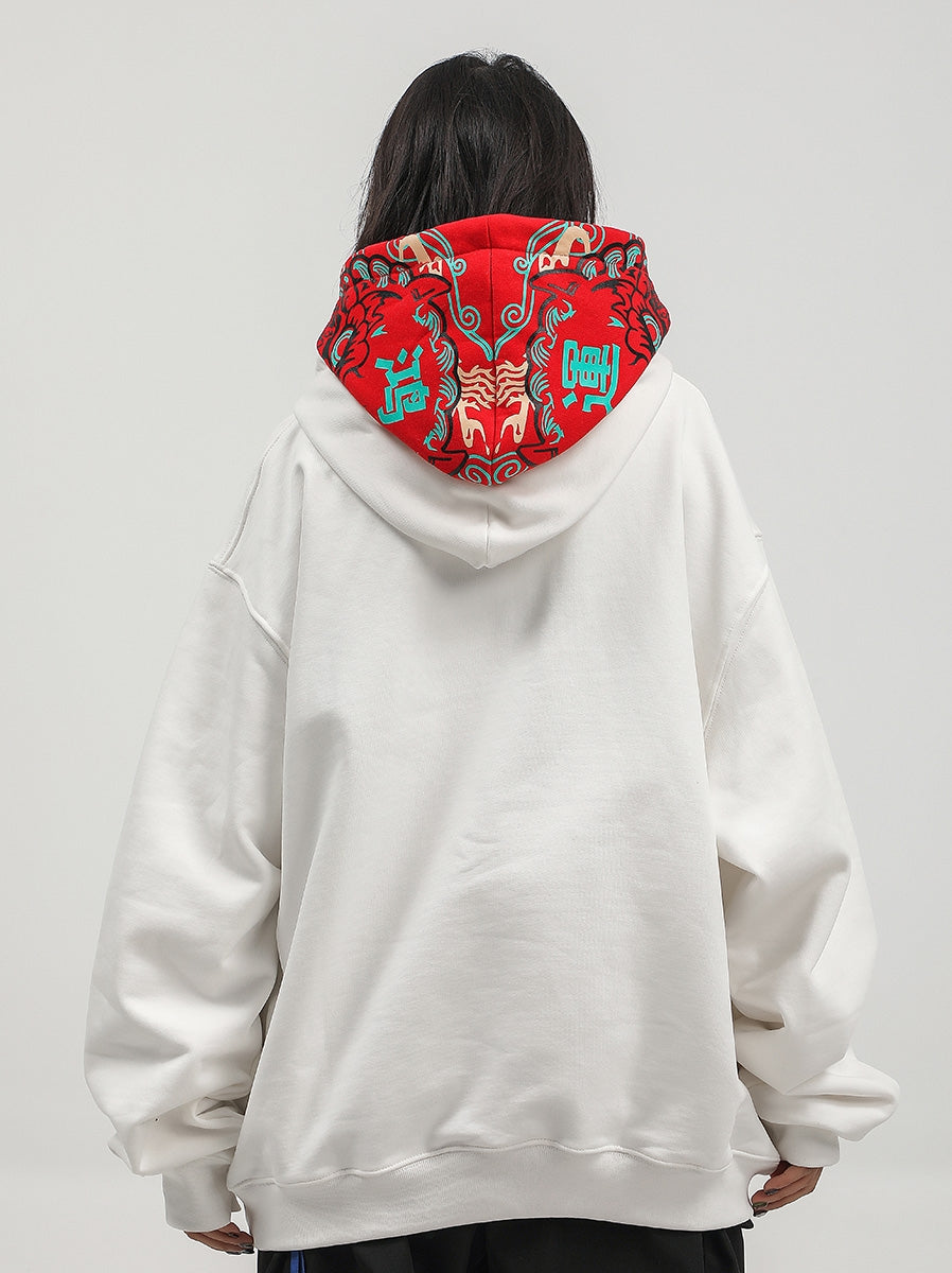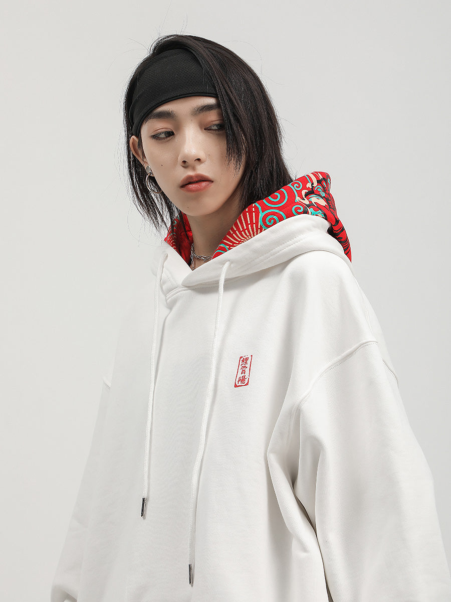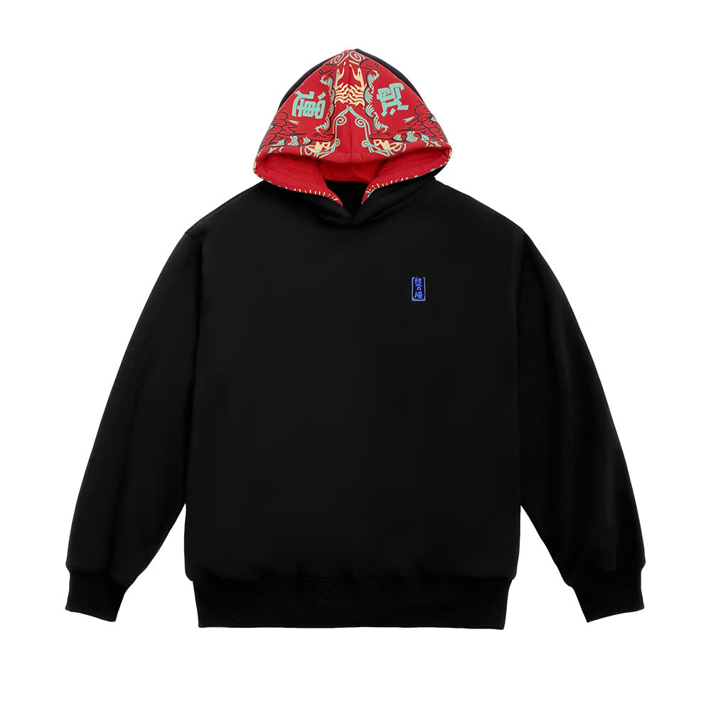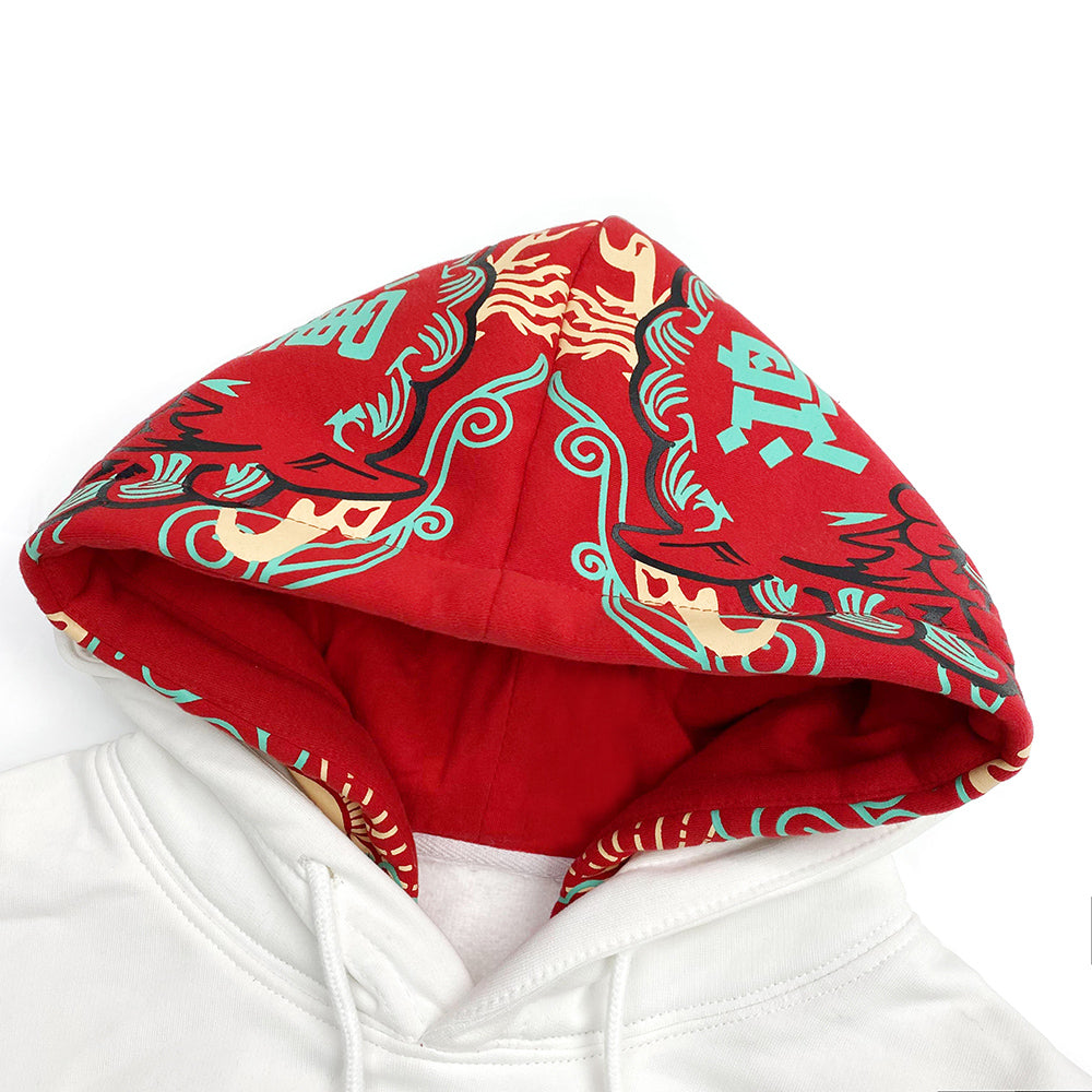 • Exterior & Interior Design: Exterior blank for a casual look; interior features a red dragon design and Japanese kanji 3d graphic design on the interior hoodie and chest area.