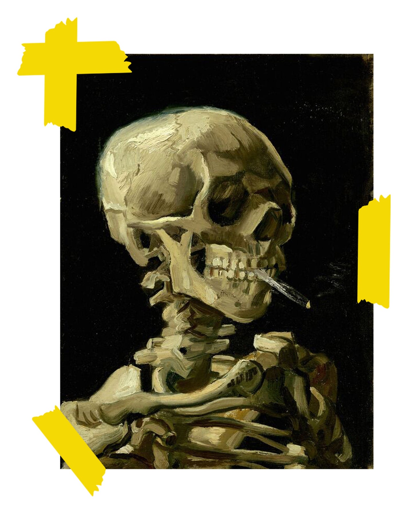 • Design: Screen print skull artwork with yellow tape on the borders.