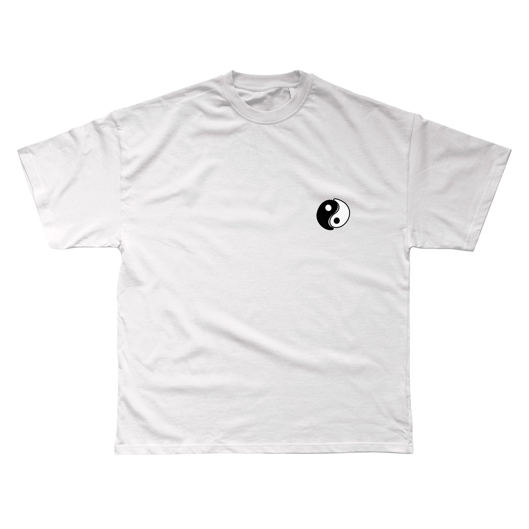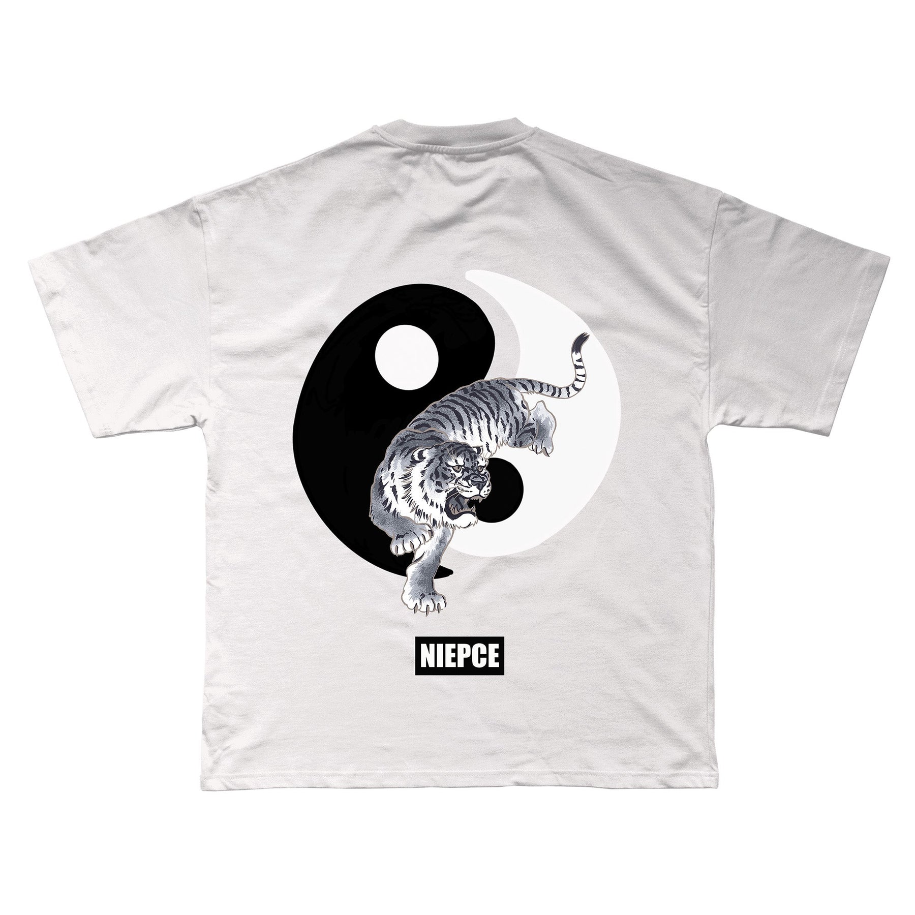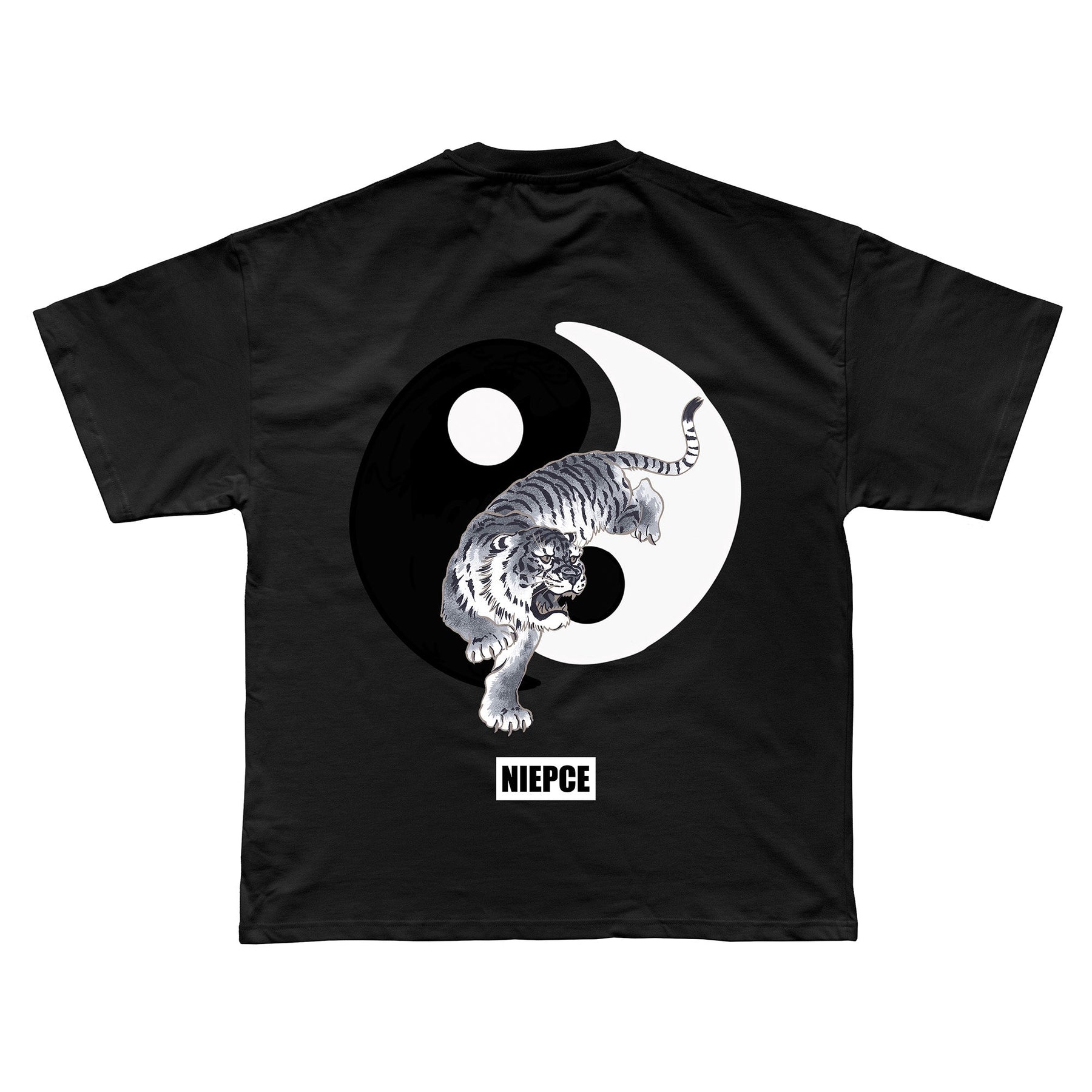 • The short sleeve t-shirt features a black and white tiger with a yin yang graphic in the background