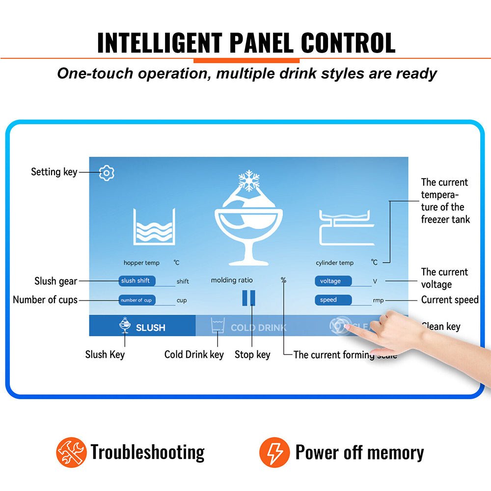 • Safety & reliability: The slush maker has a password lock function to avoid other unauthorized personnel from operating it. It displays potential warnings in advance and provides solutions on the machine so that you can find and solve problems quickly