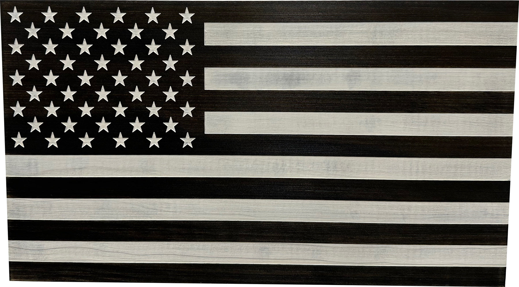 • Patriotic design: Wall-mounted, engraved and hand-painted Black & White Distressed American Flag motif.