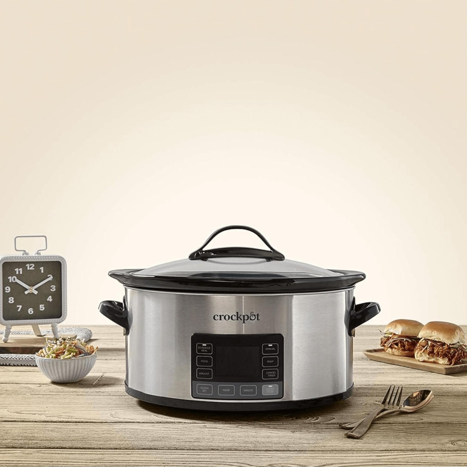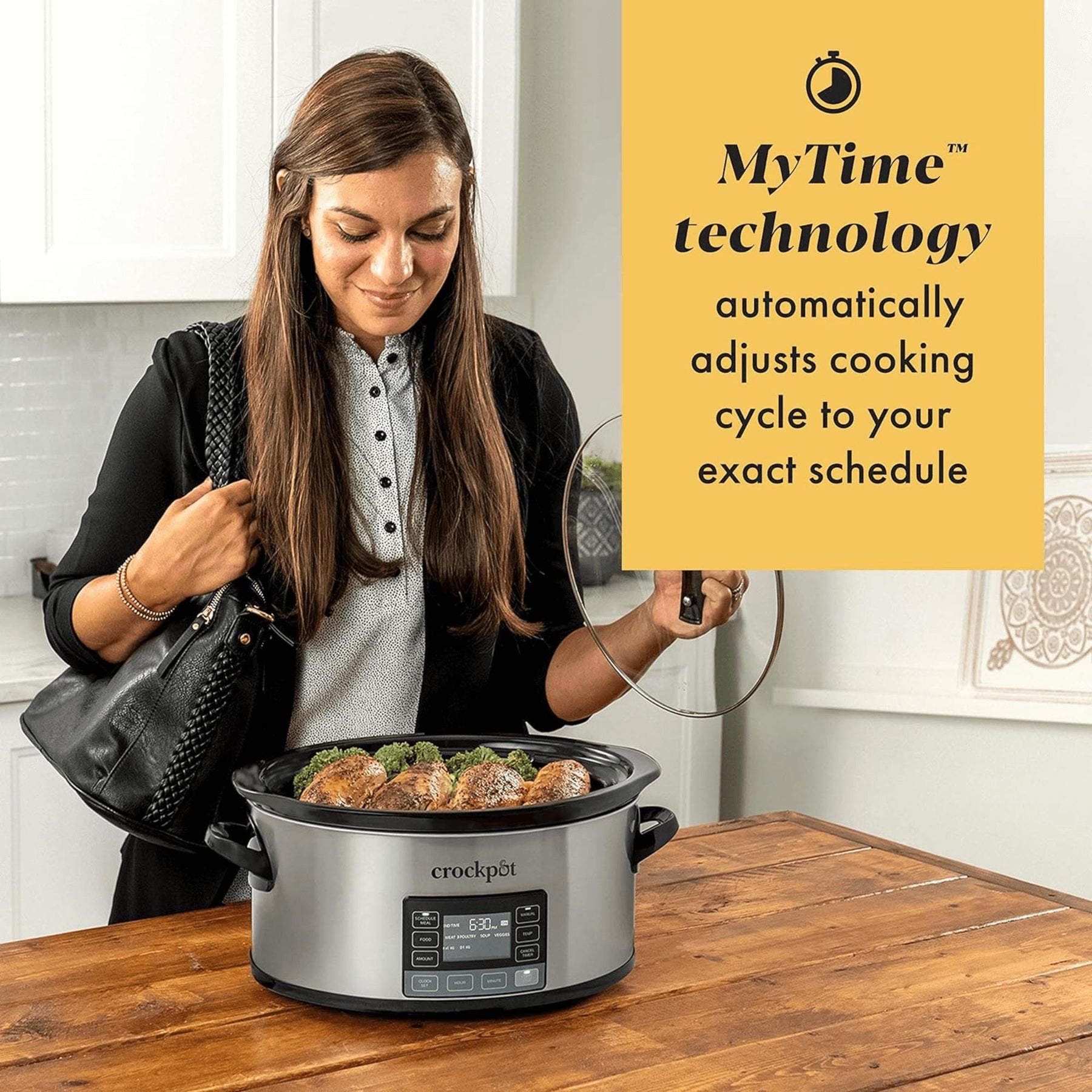 The Crockpot 6-Quart My Time Digital Programmable Slow Cooker and Food Warmer is the world's first slow cooker with MyTime Technology, designed to bring home-cooked meals to your schedule. It’s perfect for busy households who want dinner ready exactly when they want it—no more guessing, no more last-minute kitchen chaos.