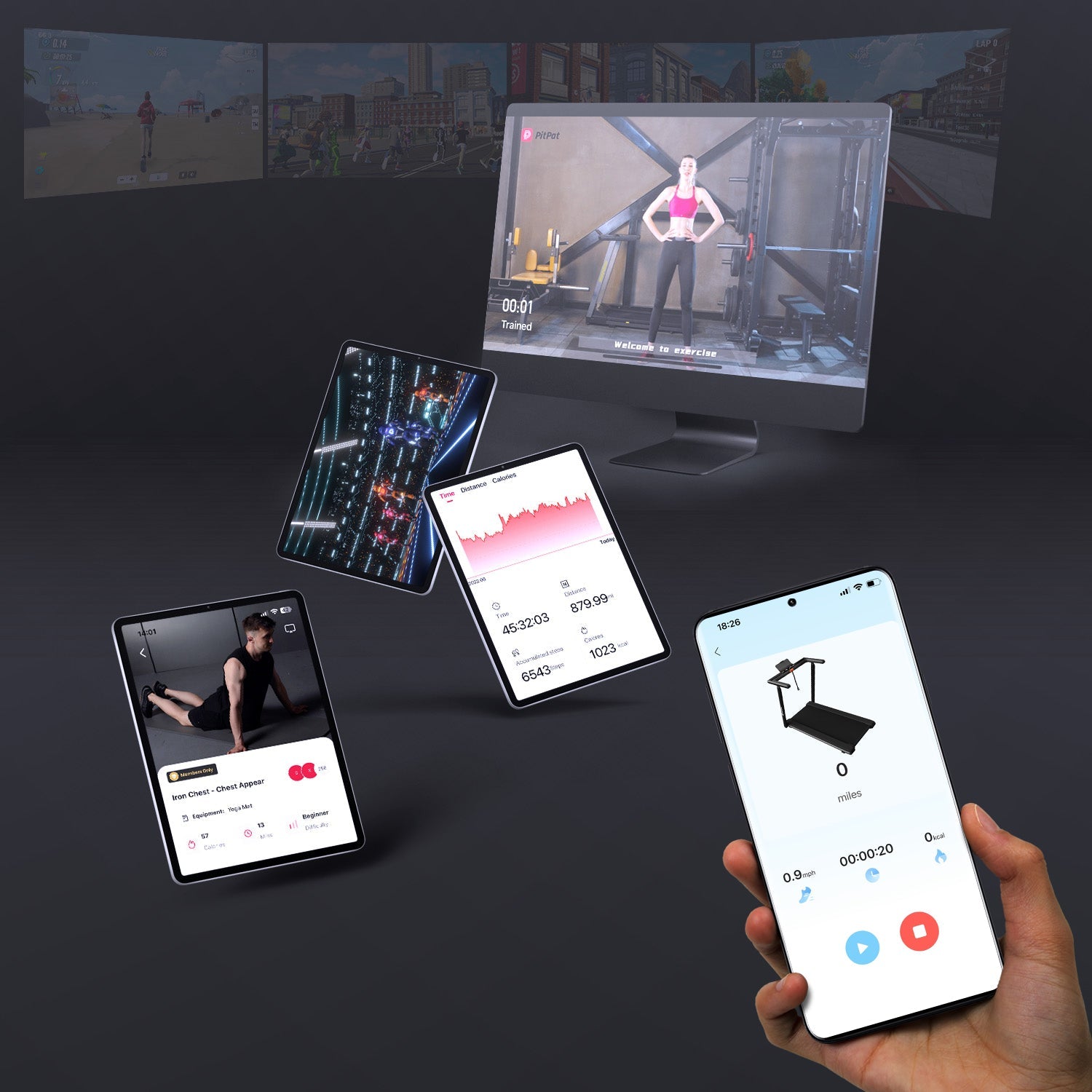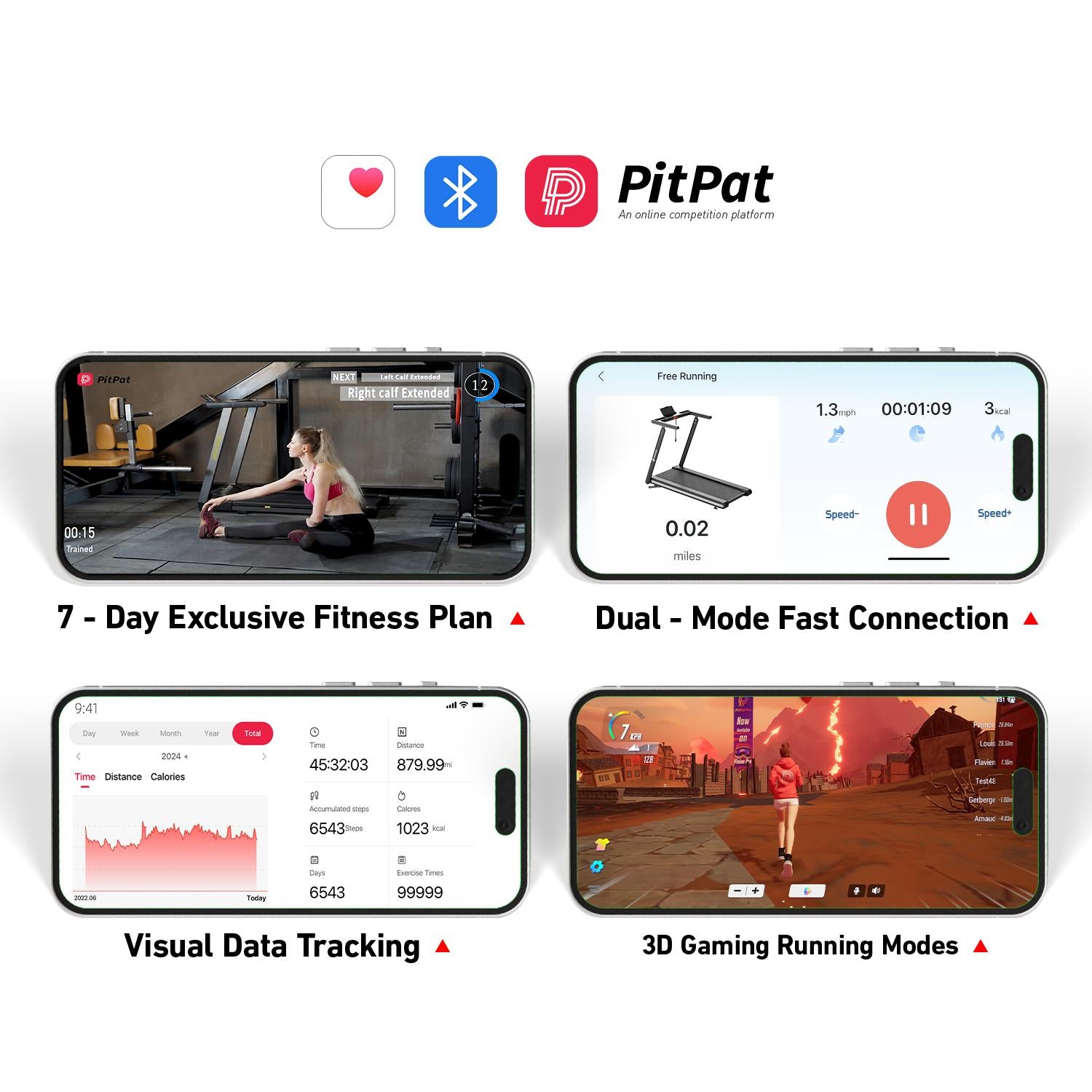 • PitPat app integration synchronizes real-time workout data, lets you play 3D games, join cash contests, and access 100+ classes.