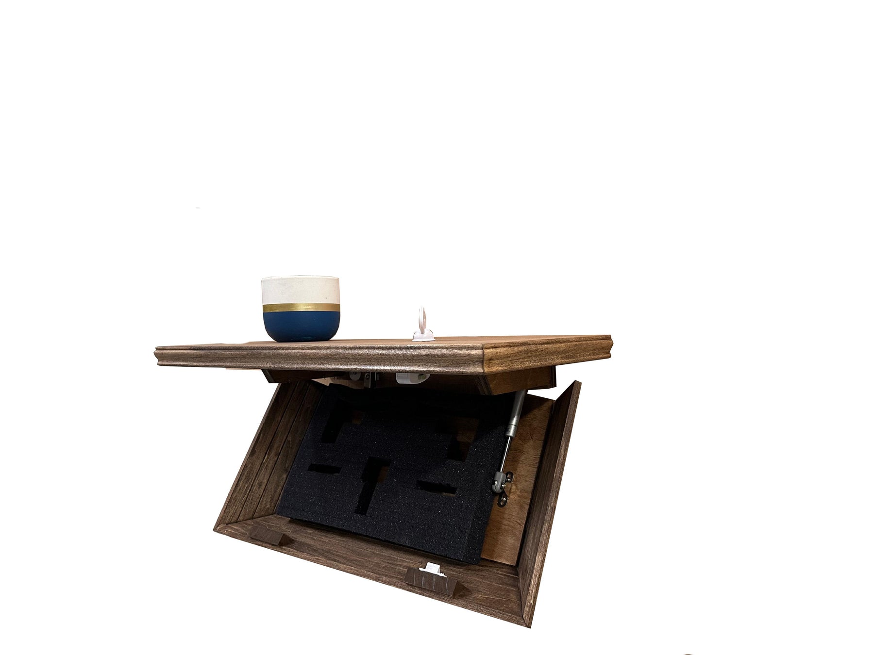 Includes all necessary installation hardware for a straightforward setup. Designed to be both a beautiful floating shelf and a secure concealed gun storage shelf, this piece keeps your firearm accessible in under a second without compromising your interior design.