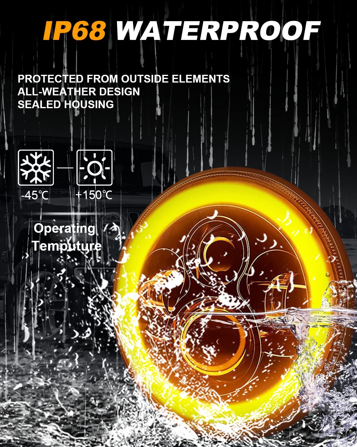 • 7 inch round LED headlights with Halo Angel Eyes DRL and Amber Turn Signals