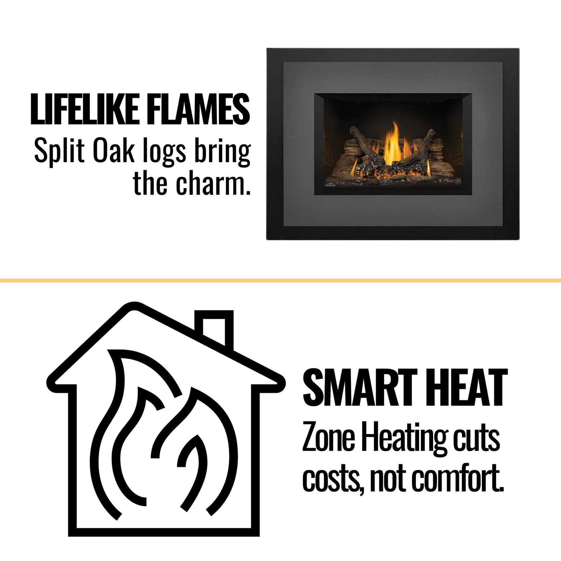 • Premium Split Oak log set and “H” style burner deliver a full firebox of realistic flames, creating a captivating centerpiece.