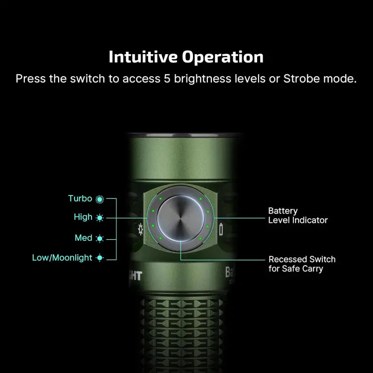 OLIGHT BATONTURBOODGRGL Baton Turbo Compact EDC Flashlight with 510m Long-Range Beam - OD Green is a pocket-sized powerhouse built for outdoor enthusiasts who want serious light without the bulk. At finger-length, it delivers a 510-meter throw and 1,000 lumens, ready for camping, hiking, or cave adventures.