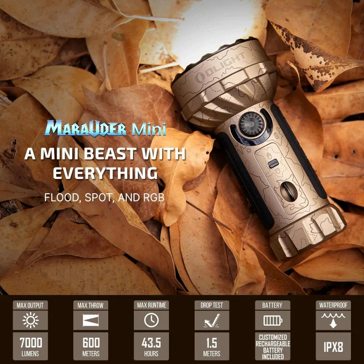 Meet the OLIGHT MARAUDERMINIT Marauder Mini: a compact powerhouse designed for outdoor explorers who demand serious brightness and versatile color options. Desert Terrain styling hides in plain sight—and shines when you need it.