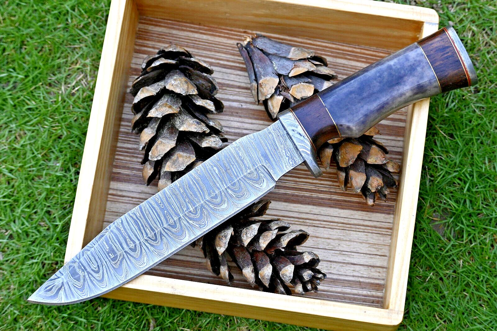 Meet the Wilderness Explorer Hunting Bowie Knife—a robust companion for serious outdoorsmen and women. With a Damascus steel blade and a Colored Bone and Rosewood handle, it’s built to perform when the trail gets tough.